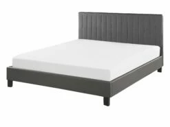 Add a modern vibe to your master suite with this chic bed frame. The upholstery made of faux leather is durable and easy in maintenance. A decorative headboard of the bed adds cosiness to the piece, whereas black wooden legs complement its overall look. A sturdy slatted base perfectly supports a mattress and guarantees a good night sleep.