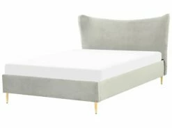 This stylish modern bed will add a chic and elegant touch to your bedroom. Its frame and headboard are upholstered in a pleasant to the touch velvet fabric. The golden slender legs emphasise the design of the bed, while the wooden slatted base improves your sleeping comfort.