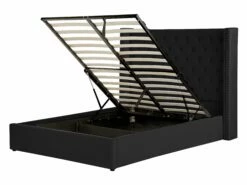 Add a touch of glamour to your bedroom with this elegant bed frame. The piece seamlessly blends vintage forms with modern influences which makes it ideal for contemporary as well as retro interiors. It features a durable wooden construction and polyester velvet upholstery in a black tone. The storage placed under the slatted frame is easily accessible and hold plenty of space. The bed is decorated with a classic, button tuft and nailhead trim.