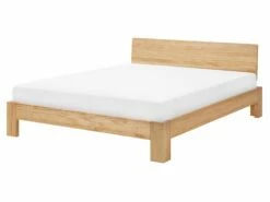 Modern simplicity featured in this bed would fit well within any bedroom space, from minimalist Scandinavian style to the rich decor of a boho-influenced interior. Constructed from solid pine wood in a light tone it radiates a natural charm and a welcoming look. The headboard design allows placing the bed in the middle of a room. The set includes a robust slatted frame that holds a mattress firmly in place.